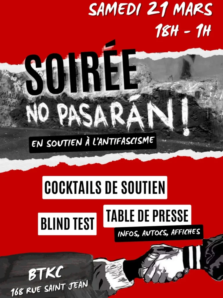 Soirée NO PASARÁN ! 🏴🚩 Le samedi 21 mars, après le carnaval antifasciste à 16h, viens soutenir l’antifascisme pendant une soirée spéciale avec cocktails de soutien, blind test et table de presse avec infos, autocs et affiches à choper ! #nopasaran
