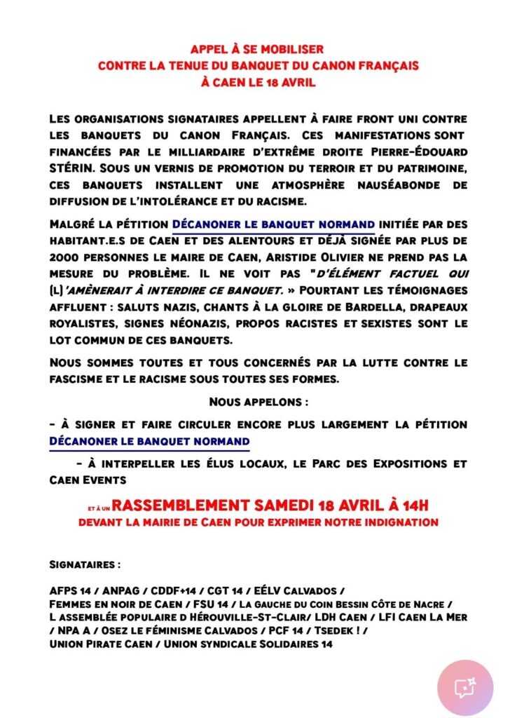 MALGRÉ LA PÉTITION DÉCANONER LE BANQUET NORMAND INITIÉE PAR DES HABITANT.E.S DE CAEN ET DES ALENTOURS ET DÉJÀ SIGNÉE PAR PLUS DE 2000 PERSONNES LE MAIRE DE CAEN, ARISTIDE OLIVIER NE PREND PAS LA MESURE DU PROBLÈME. IL NE VOIT PAS « D’ÉLÉMENT FACTUEL QUI (L)’AMÈNERAIT À INTERDIRE CE BANQUET. » POURTANT LES TÉMOIGNAGES AFFLUENT : SALUTS NAZIS, CHANTS À LA GLOIRE DE BARDELLA, DRAPEAUX ROYALISTES, SIGNES NÉONAZIS, PROPOS RACISTES ET SEXISTES SONT LE LOT COMMUN DE CES BANQUETS.